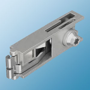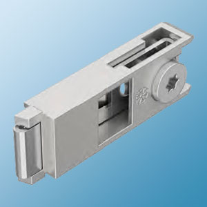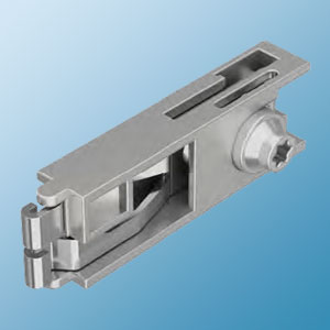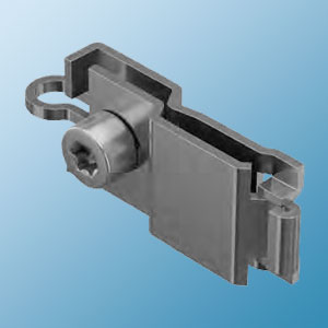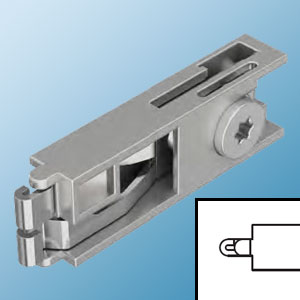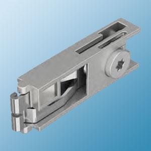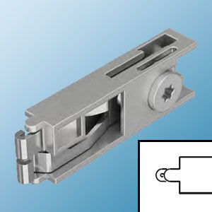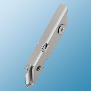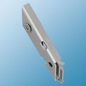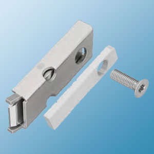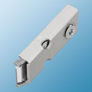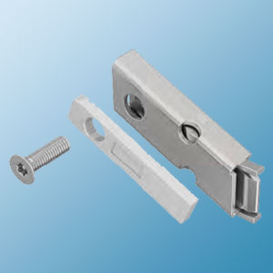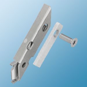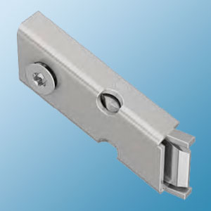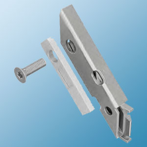 - Uniones a 90°. La clásica y patentada tensochapa Octanorm, así como su variante para curvas. Con adaptadores plásticos se puede ajustar el elemento a cámaras de perfil más grandes. Las hay de acero o de una combinación de acero y una aleación de zinc. Con sistema de agarre de uno o dos ganchos tensores permiten ser usados en la mayoría de los perfiles con ranura.
